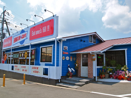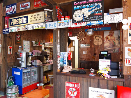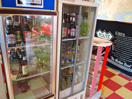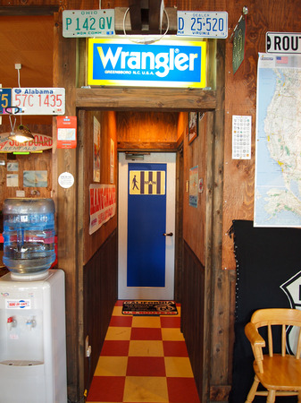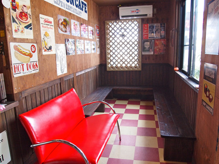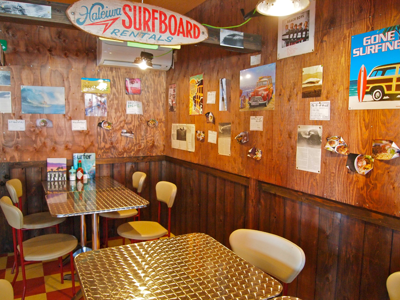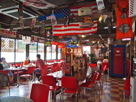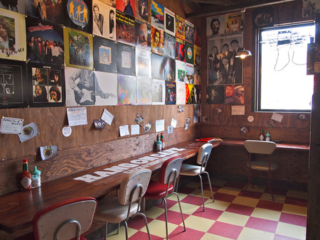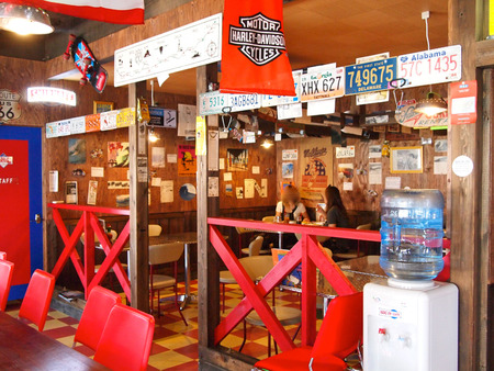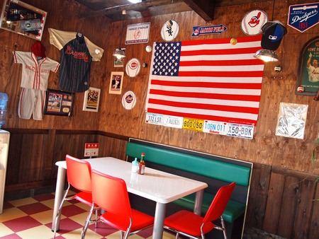 アメリカンな雰囲気全開の店内。真ん中のテーブルと手前に少し写ってる丸テーブルは喫煙エリア。