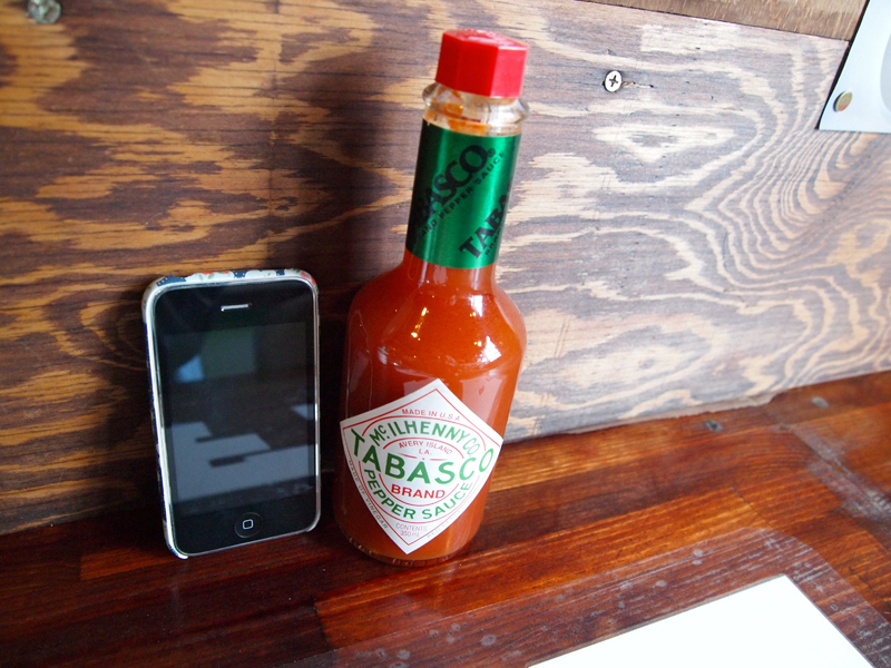 全テーブルに置かれてるビッグタバスコ。iPhoneと比べてみました(笑)