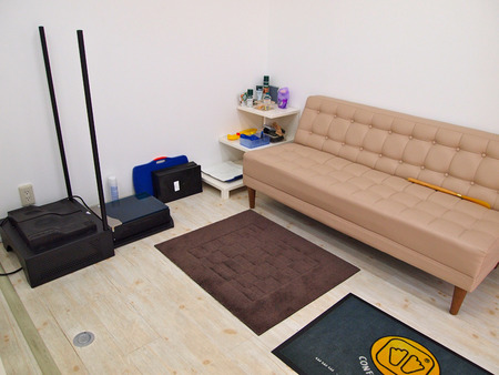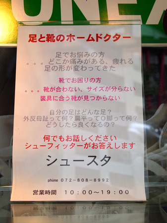 ここで写真左の黒い専用器具を使って、足の計測を行います。(足の診断は無料)