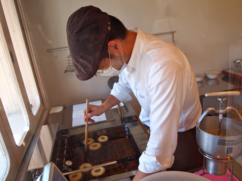 左を向くと実際にドーナッツを揚げてるところなどが見られます。