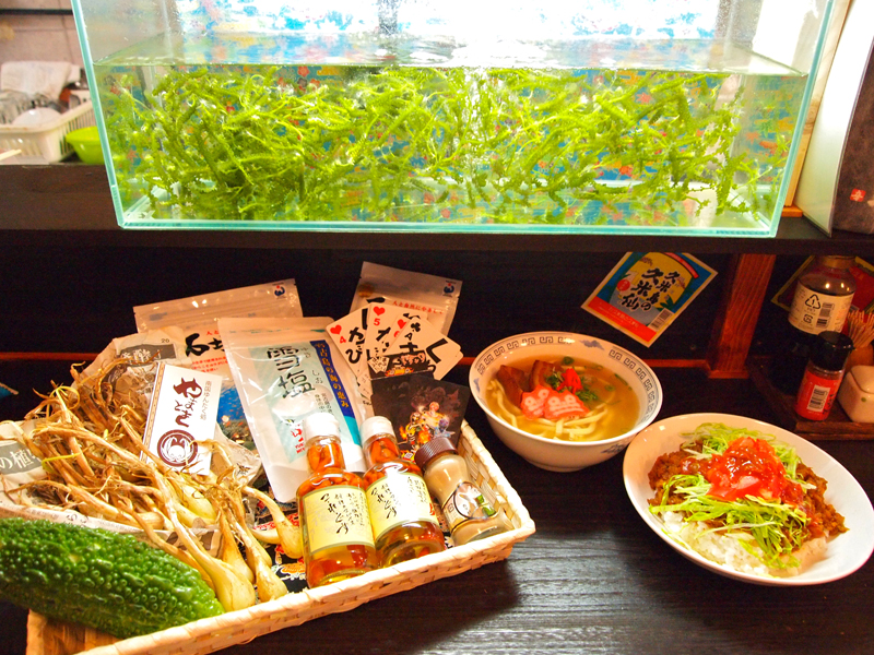 海ぶどうが入った水槽(写真上)とゴーヤー、島らっきょう、島とうがらしなどの沖縄名産(写真左)、そして自家製鶏がらスープを使った沖縄そば(680円)とタコライス(500円)。