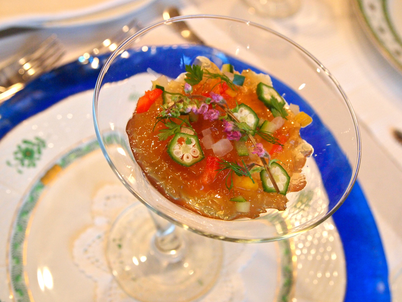 「蟹と帆立のタルタル甲殻類のコンソメジュレ 穂紫蘇の香りと共に」。