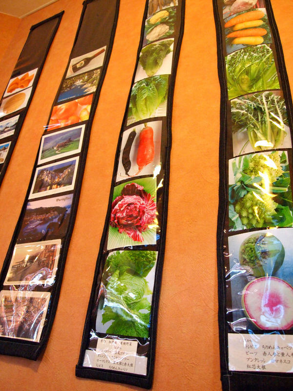 お店で扱っている京都・賀茂産の野菜やイタリアの写真などが飾られています。