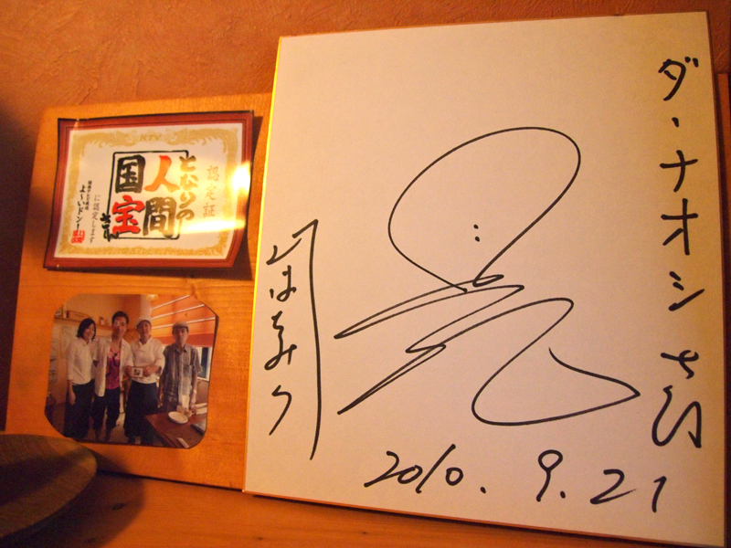 店内に入るとすぐ右側に「となりの人間国宝」のステッカーと月亭八光のサインが。