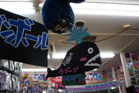 ONE PIECEに登場するクジラ「ラブーン」。商品は写真上の人形なんですが、こういう手書きで作られたPOPがたくさんあって、お店の特徴になってます。