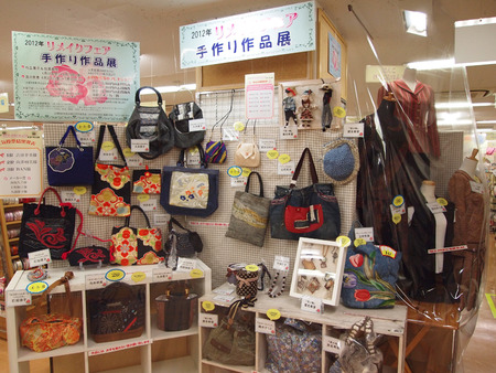 リメイクフェア 手作り作品展コーナー。応募のあったオリジナルリメイク作品が期間限定で展示されています。