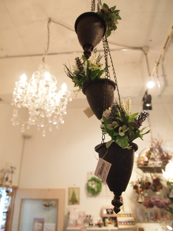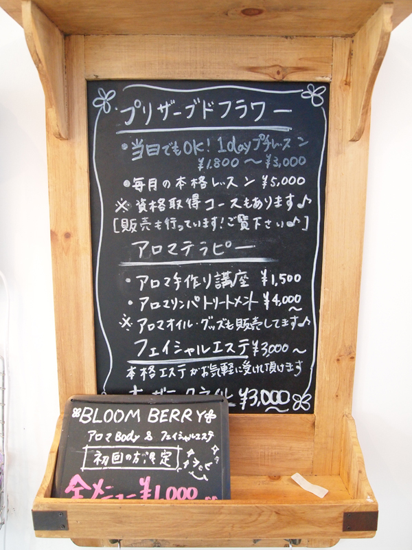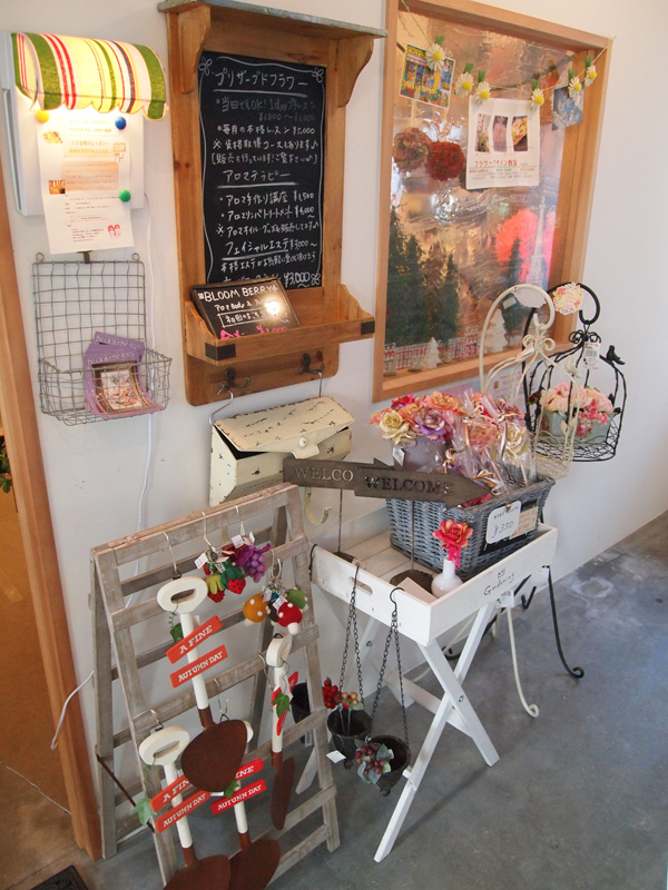 キレイなお花雑貨の後ろにひらつーのマスコット「ぼしひこくん」が描かれた黒板が見えてます。BLOOM BERRYさんはひらつーオフィスのお隣さんなのです。