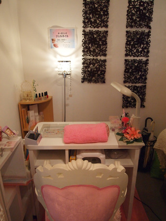 店内奥にはオーガニックジェルネイル(3,000円~)ができるスペース。隣にはアロマトリートメントができるベッドもあります。アロマやアロマキャンドルの手作り講座もされています。