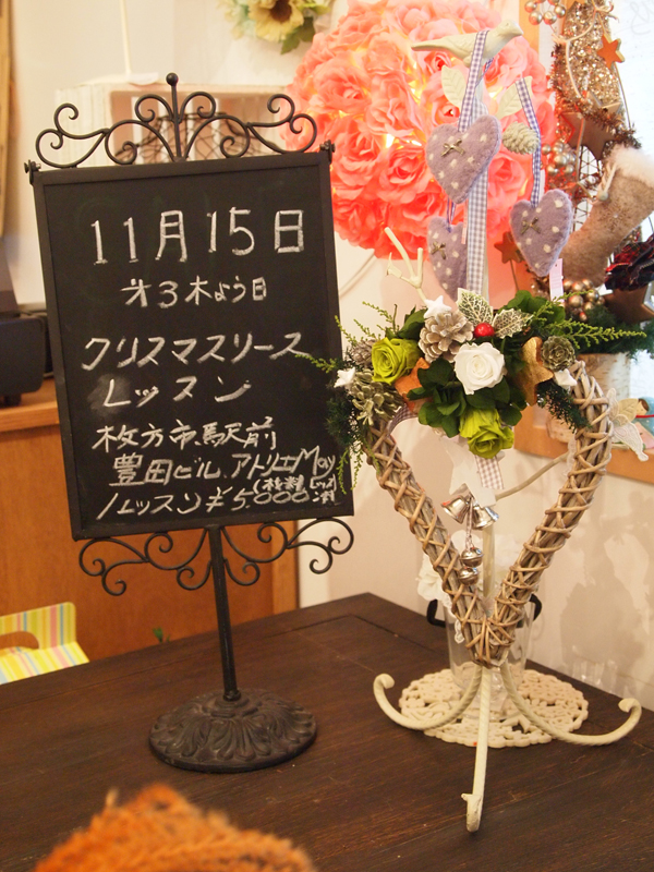 11月15日より毎月第3木曜日に枚方市駅前のアトリエMayでレッスンを開催。第1回目は「クリスマスリースレッスン」(10:30~12:30/限定8名)。ドイツから仕入れた資材を使用するので形も独特で日本では見かけないリースですね。
