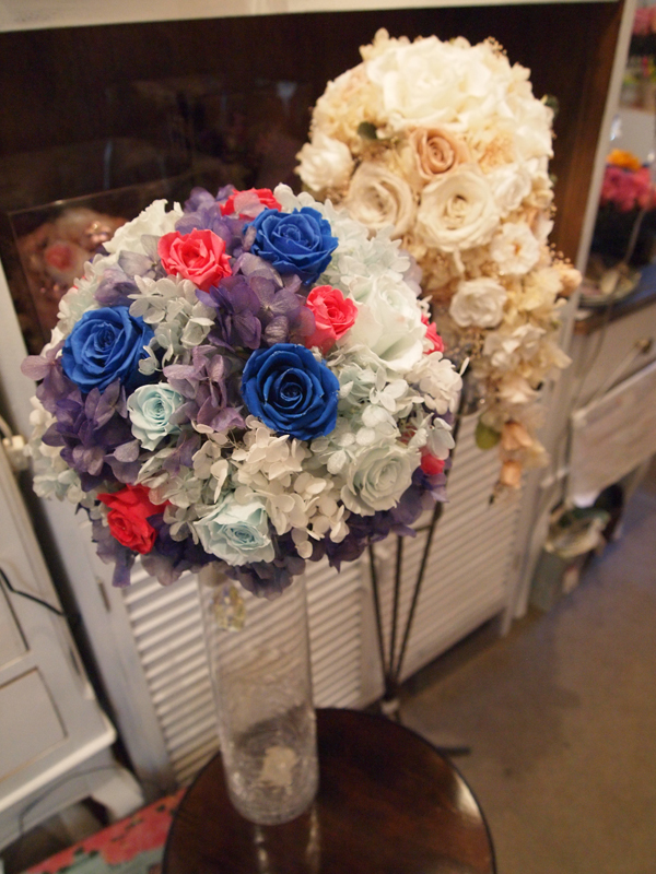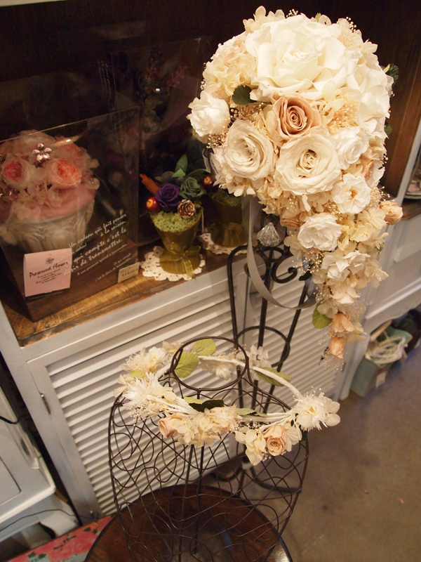 ブーケ。「プリザーブドフラワーブライダルレッスン」というレッスンもされていて、ウェルカムボードやヘッドドレス(髪飾り)、ラウンドブーケ(ブートニア)など、オリジナルで準備することができます。