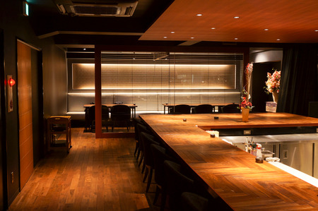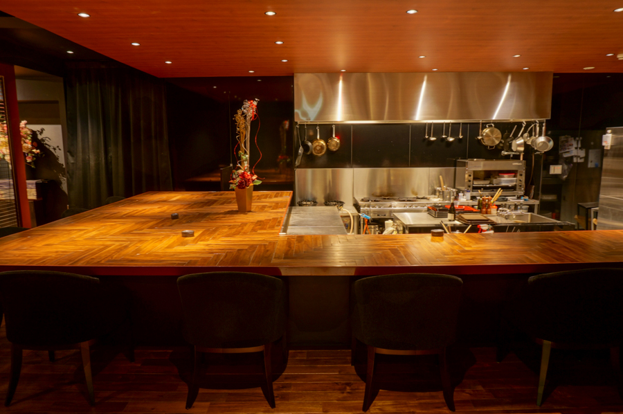 店内に入ると大きなカウンター席(11席)が見えます。お店のこだわりを伺ったところ「牧野や枚方にはあまりない珍しい空間づくりと、座っていただいたら分かっていただけると思いますが、ゆったりとくつろげる席が特徴です」とのこと。はじめてお店に入られると空間のギャップに驚かれること間違いなしのまさに「隠れ家」といった感じです