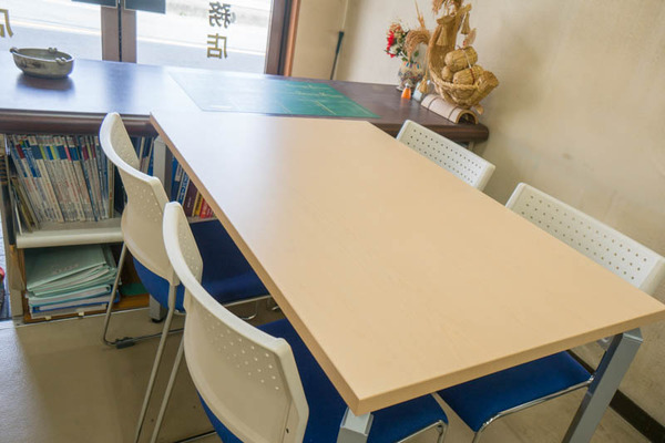商談スペースの脇の棚には、壁紙やタイルなどのサンプルのカタログがぎっしり。