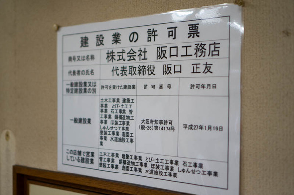 事務所の奥には建設業の許可証が。