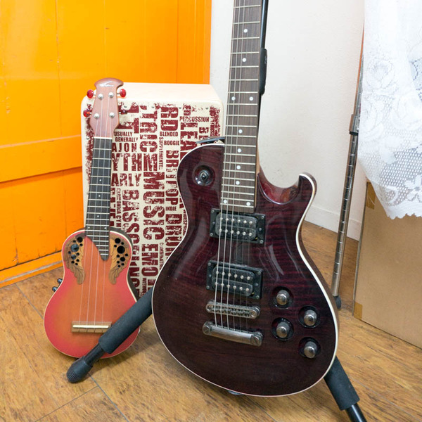 店内には、ギターやウクレレ、カホンという太鼓のような珍しい楽器も。
