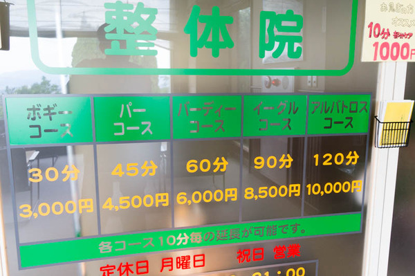 ゴルフ場に併設されている整体院ということで、整体のコース名もゴルフにちなんだものに。ユニークですね〜