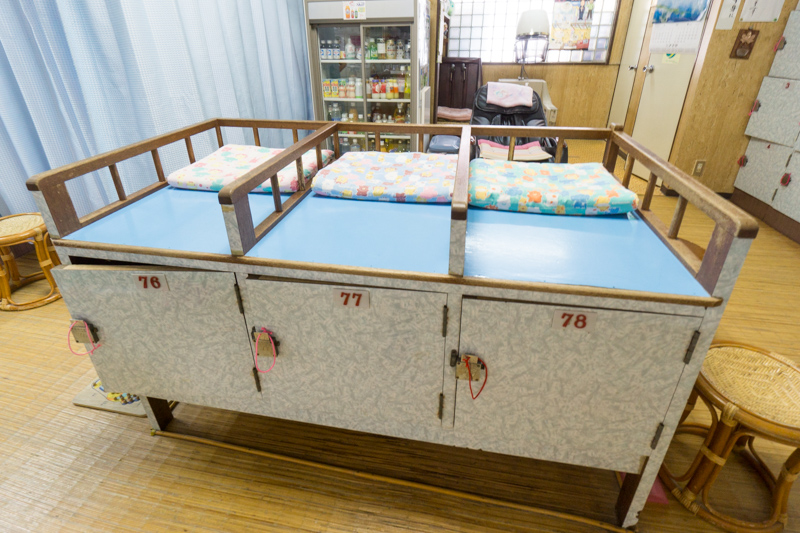 「脱衣所でのお願い」の前には、常連さんのお風呂セットが並んでいました。