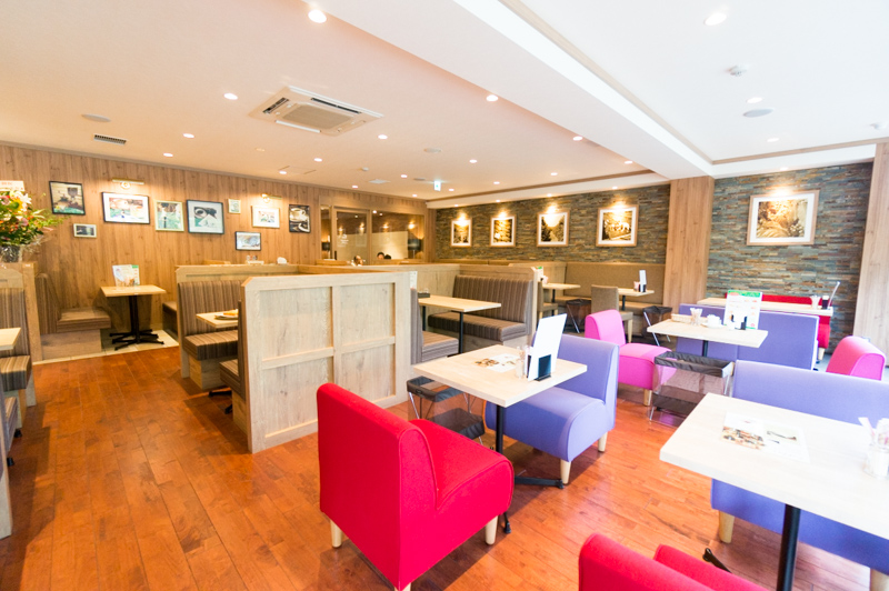 窓側は、外の空間を楽しめる開放的でカラフルな椅子が並ぶ席。