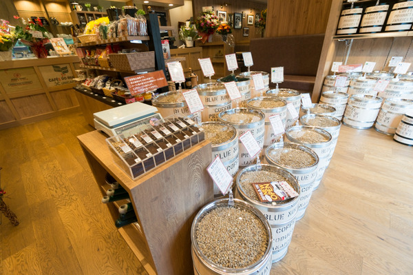入って正面には珈琲の生豆(きまめ)が入った木樽が並んでいます。