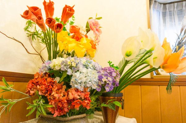 店内には奥様が作った造花のフラワーアレンジメントがたくさん。