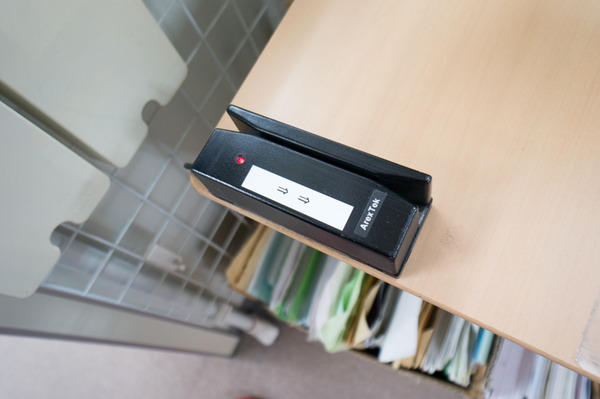 こちらの機械にカードを通すと、保護者の方に入退室したことをお知らせするメールが届くようになっています。