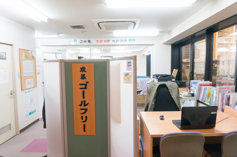 お部屋に入るとすぐに見えるのは、教室長のデスクと「成基ゴールフリー」と書かれた立派な看板が。