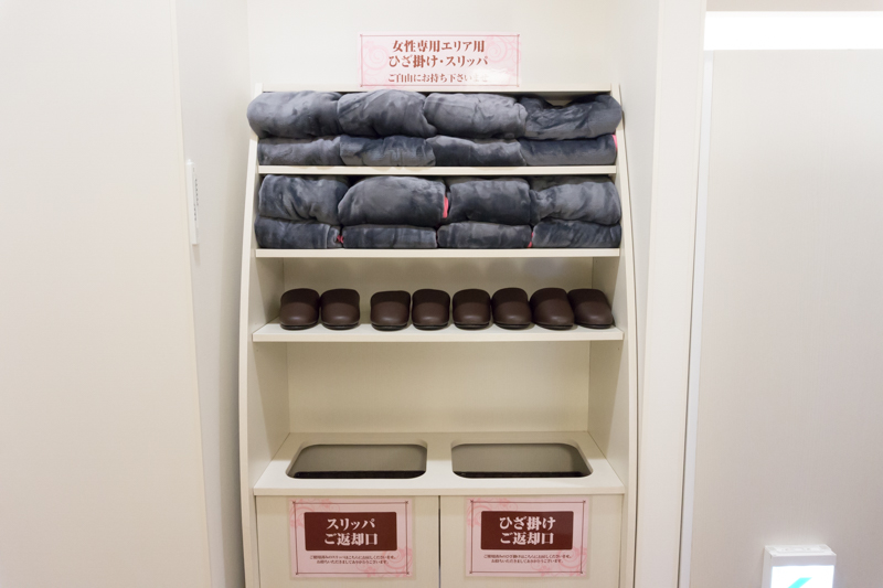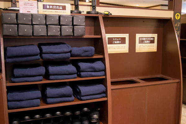 無料の貸し出し品として、ブランケットやスリッパ、肘置きなども。