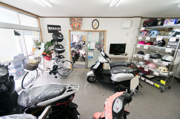 近隣にお住まいの方はご年配の方やファミリーも多いので、バイクの販売や修理に限らず、シニアカー・電動自転車など幅広く商品を取り扱っております。