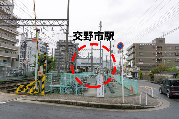 お店の隣の踏切を渡ると、イズミヤ交野店のある交野駅前の交差点に出ます。