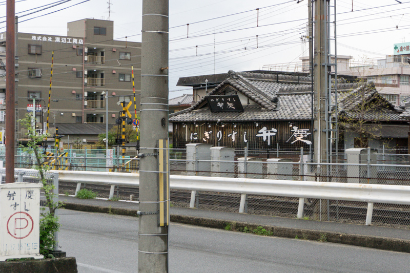 駐車場からお店を見るとこんな感じ。線路を挟んで斜め向かいです。