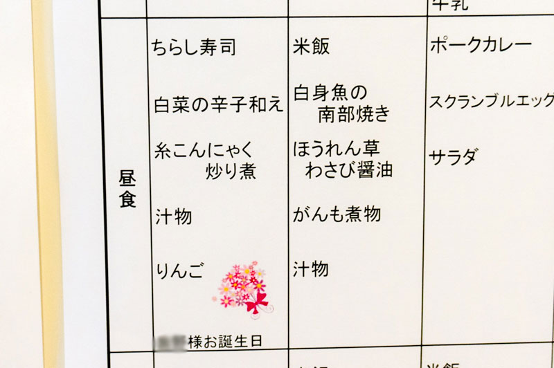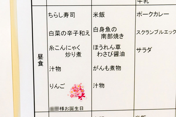 入居者さまの誕生日にはお花のシールが貼られており、献立は誕生日の方の好きなメニューでお祝いするそうですよ!