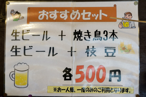 おすすめセットは「生ビール」+「焼き鳥3本 or 枝豆」が選べる、まさにオススメのコンビネーション。