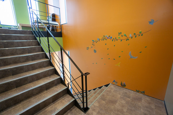 階段を上がって右側には誰でも自由に使える荷物棚と大きな黒板が!可愛い黒板アートにまたまたホッコリ。