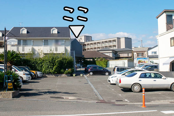 駐車場の奥に見える建物がダーマトグラフで、駐車場を通って店内へ行くことが可能。