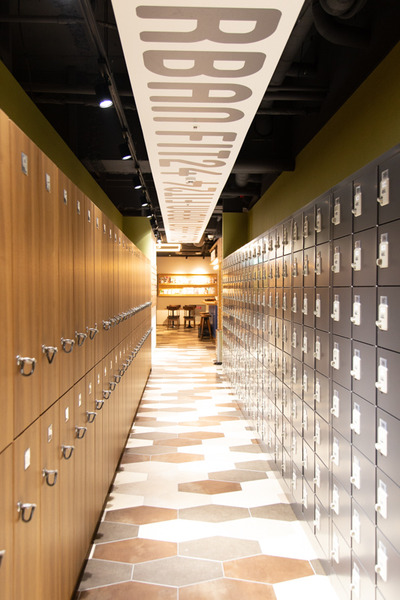 左側には受付、左奥にはロッカーや更衣室、シャワールームなどが。