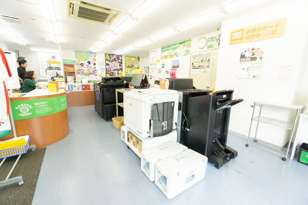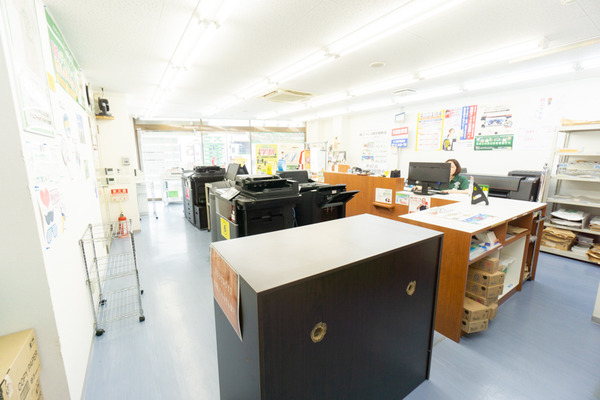事務所の中はスタッフさんの作業スペースとなっており、作業台と様々な用途で使われるプリンターなどが置かれています。