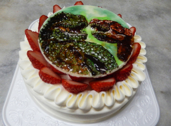出来上がったプレートをイチゴをたくさん挟んだスポンジケーキに載せて完成!