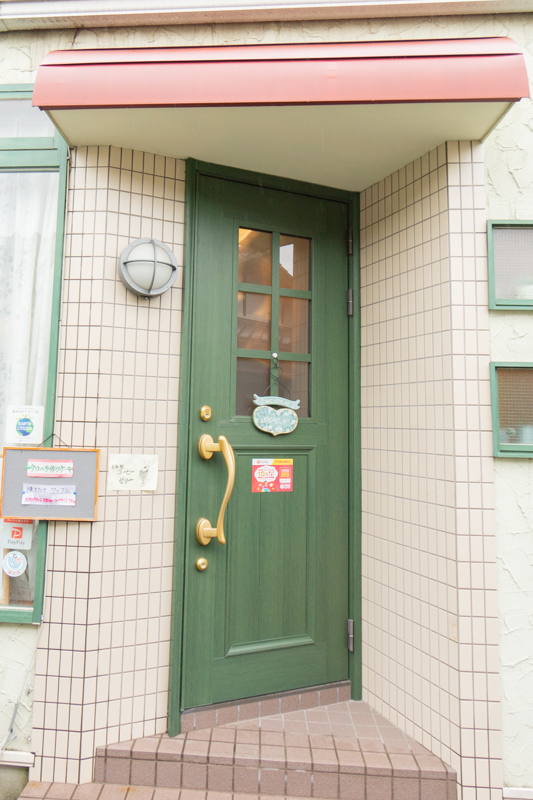 緑色のドアにトールペイントの看板がかかっています。