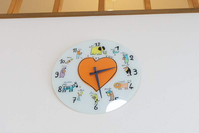見上げると動物のイラストが描かれた時計が。
