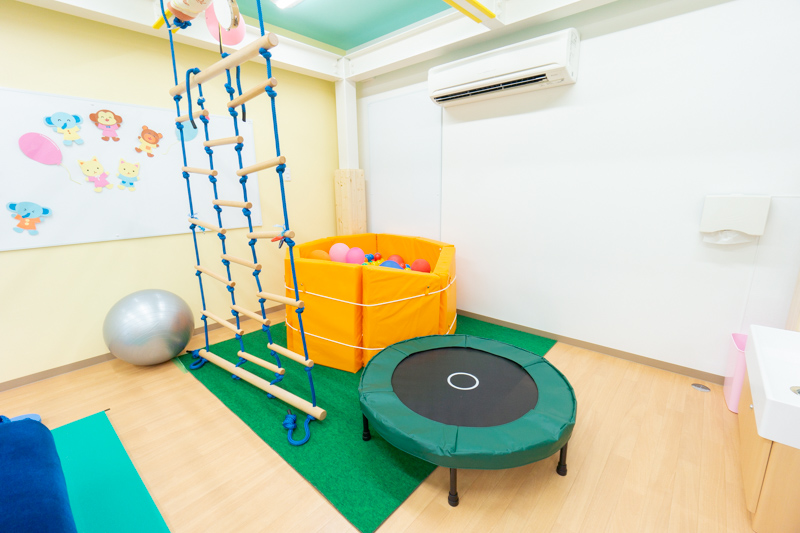 大きい教室(療育室)内では身体の使い方やバランス感覚の獲得を遊びの中で促す為の遊具(感覚調整遊具)が並んでいて、大人でも遊びたくなります!