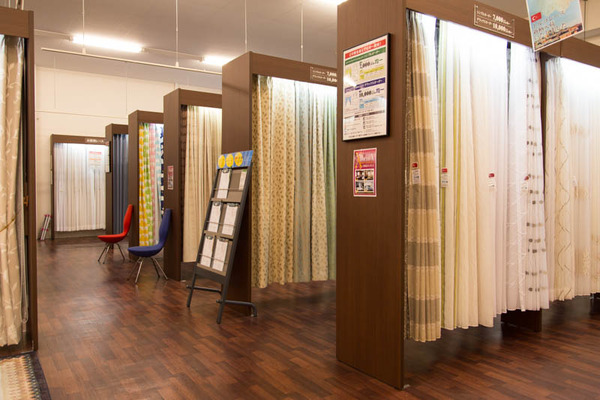 2階へ上がるとたくさんのオーダーカーテンが置かれています。