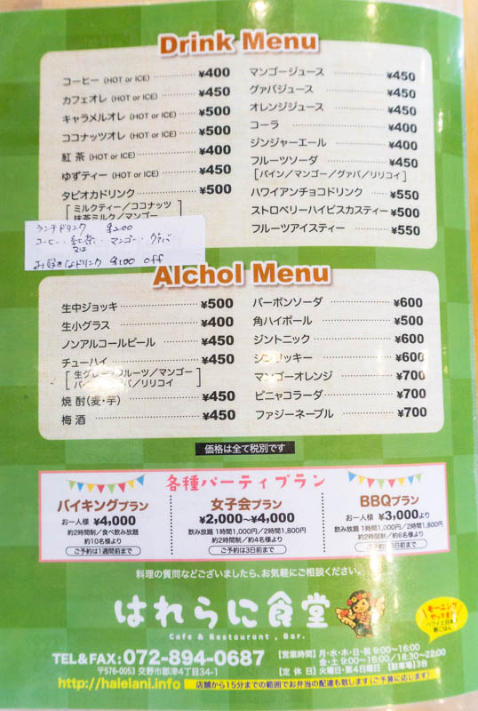 以前はハワイアンメニューがメインで店名も「Hawaiian cafe Hale Lani(ハレラニ)」でしたが、もっと日本のごはんも味わえる「食堂」にしたいと「はれらに食堂」にリニューアルしたんだそう。