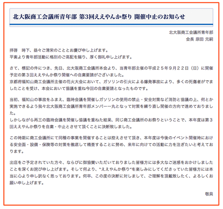 前回ご案内いたしました、平成25年9月22日(日)に寝屋川市打上川治水緑地公園多目的グランドで開催を予定しておりました、第3回ええやんか祭りは中止となりました。以下、主催者さまからになります。 福知山商工会議所主催の花火 […] -