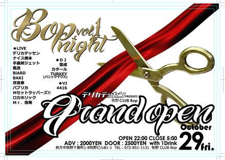 10月29日(金)牧野の松園ボウルの向かいにクラブ「BOP」オープン。オープン記念イベントにナイス橋本ら。