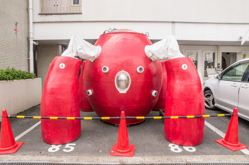 家具団地に圧倒的存在感を放つ赤いロボットのようなものが置かれてる