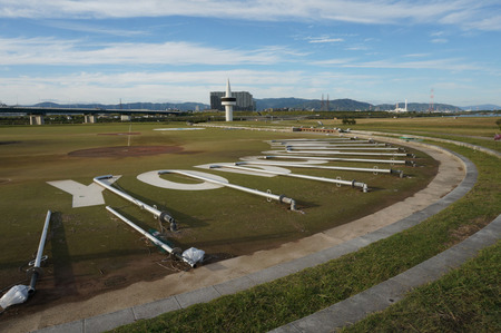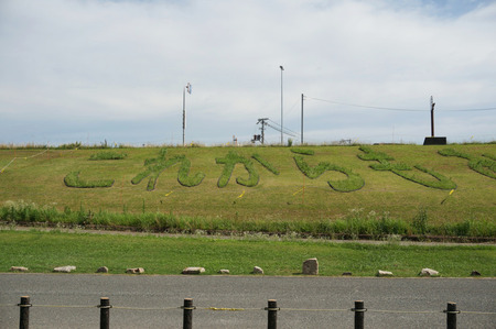 淀川河川公園の堤防斜面に芝生の巨大メッセージが描かれてる