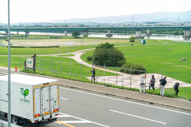 今年も河川公園枚方地区に花火用の柵設置
