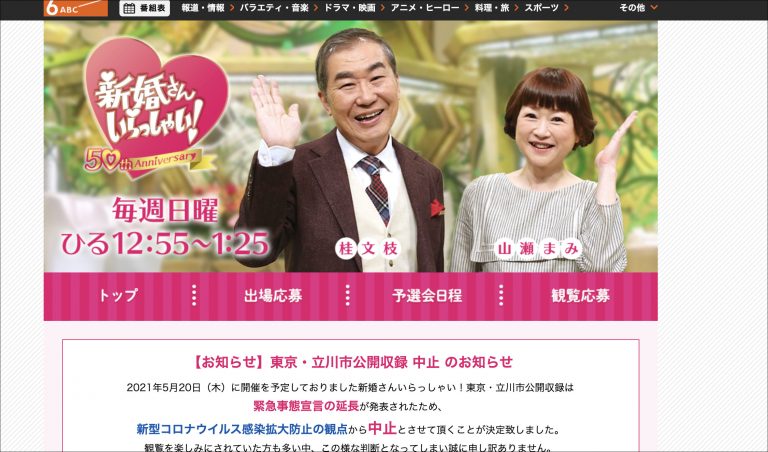 テレビ朝日「新婚さんいらっしゃい!」に枚方市の夫婦がでるようです テレビ朝日「新婚さんいらっしゃい!」はもう説明いらずの桂文枝さん、山瀬まみさんが新婚さんの楽しい話を聞くトークバラエティ。 「TVer」のテレビ番組情報↓ […] -