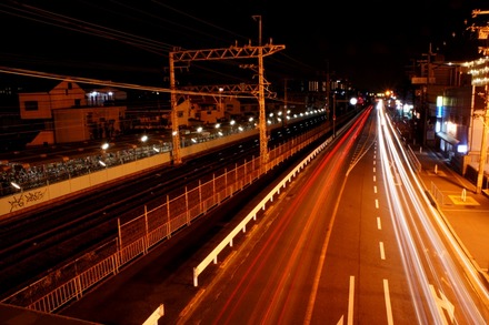 御殿山駅前の歩道橋から旧国道1号線を撮影。 反対側。 電車が来てるバージョン。車の光がヨレちゃったのが残念。 -