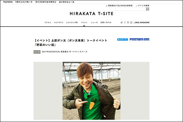 枚方T-SITEに土肥ポン太さんがやってくるようです。【イベント】土肥ポン太(ポン太青果)トークイベント「野菜のいい話」 枚方T-SITE上記リンク先によると、明日5月4日の11時ごろより枚方T-SITEの4Fにて土肥ポ […] -