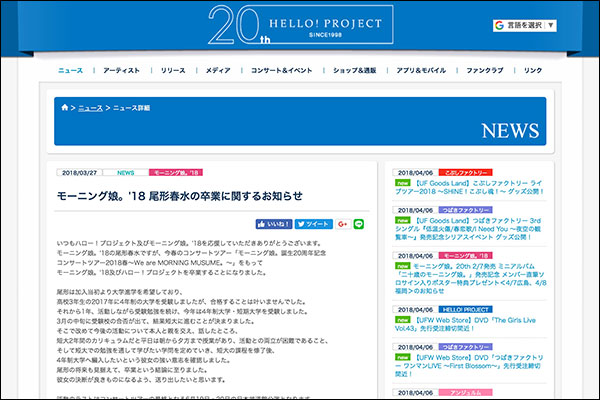 枚方出身の尾形春水(おがたはるな)さんがモーニング娘。’18とハロー!プロジェクトを6月20日の日本武道館公演で卒業することになったようです。モーニング娘。’18 尾形春水の卒業に関するお知らせ ニュース詳細|ハロー! […] -